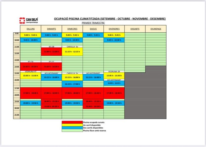 És una eina que t’ajuda a saber quins són els moments amb més o menys afluència de persones a la piscina. A més, cal tenir en compte que hi ha franges horàries reservades exclusivament per a l’ús de les escoles, durant les quals la piscina queda totalment bloquejada per a altres usuaris.
